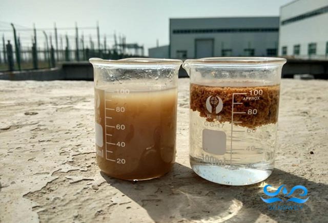 聚丙烯酰胺PAM為陽離子型高分子聚合物,吸附在顆粒表面上的高分子長鏈可能同時吸附在另一個或多個顆粒表面,通過架橋方式將2個或更多的微粒連在一起,從而導致微粒絮凝,改善污泥脫水性能。此外,陽離子型聚丙烯酰胺PAM在吸附架橋作用的同時,還可對帶負電荷的污泥膠體顆粒產生電中和作用,獲得更好的絮凝效果。但當其投加過量時,溶液中高濃度的高分子也能使顆粒表面完全被所吸附的高分子覆蓋,架橋作用大大減弱,而且過量的陽離子會使污泥顆粒帶上正電荷,重新相互排斥,絮凝效果快速下降,污泥脫水性能變差。